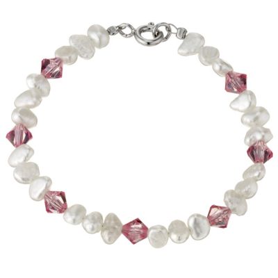 Gleaming, creamy freshwater pearls, and cute cut pink crystals, bring a summer look to this girl's bracelet. Matching necklace available.