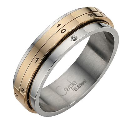 Chic and unique, this funky two colour stainless steel numbered ring oozes contemporary elegance. A subtly sparkling diamond adds a splash of indulgence. Size Small - Q1/2.